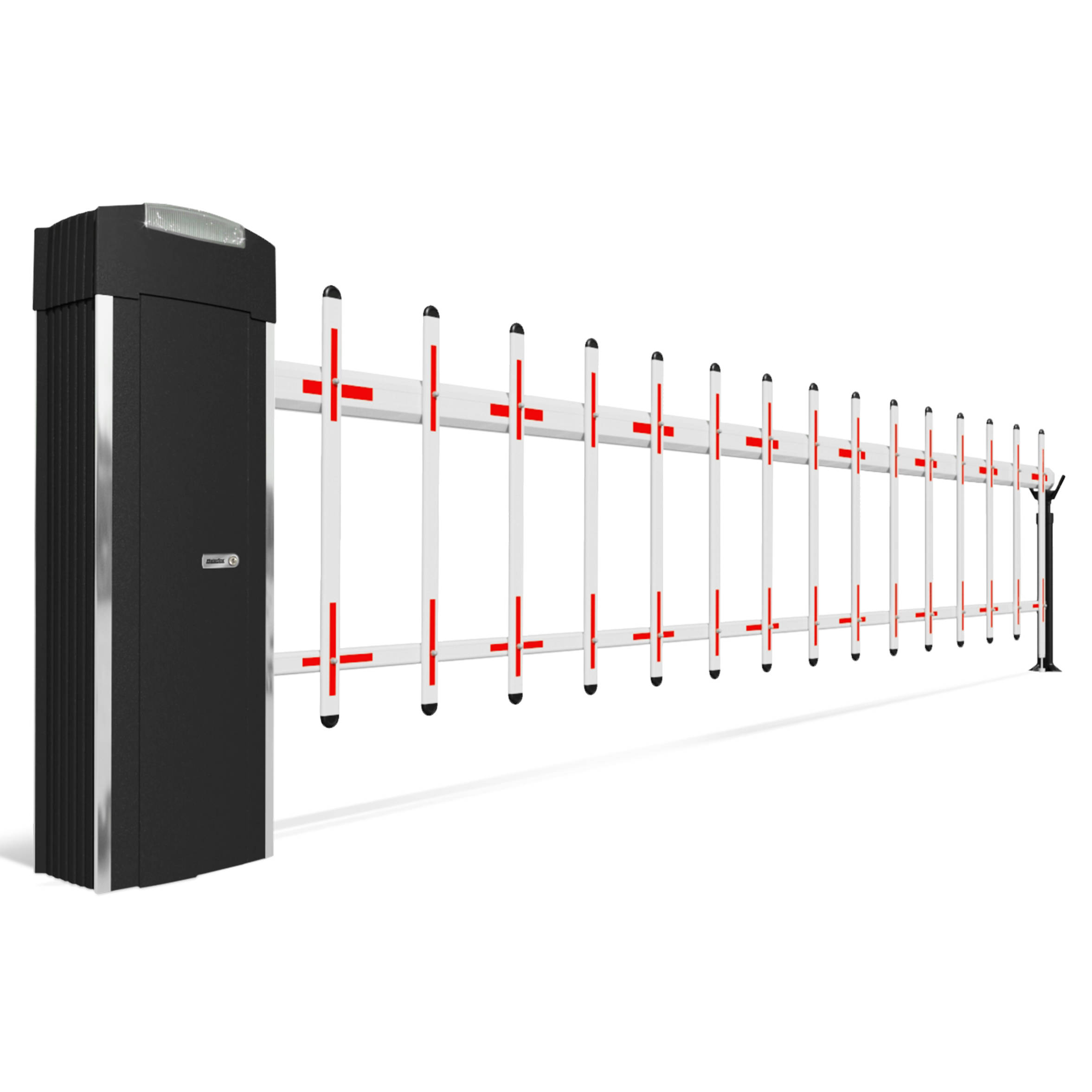 Barrière électromécanique avec châssis en acier galvanisé et revêtement extérieur en aluminium laqué sablé. Il intègre une lisse en aluminium jusqu’à 5m avec filet articulé, idéale pour le contrôle du trafic et l’interdiction de passage.
